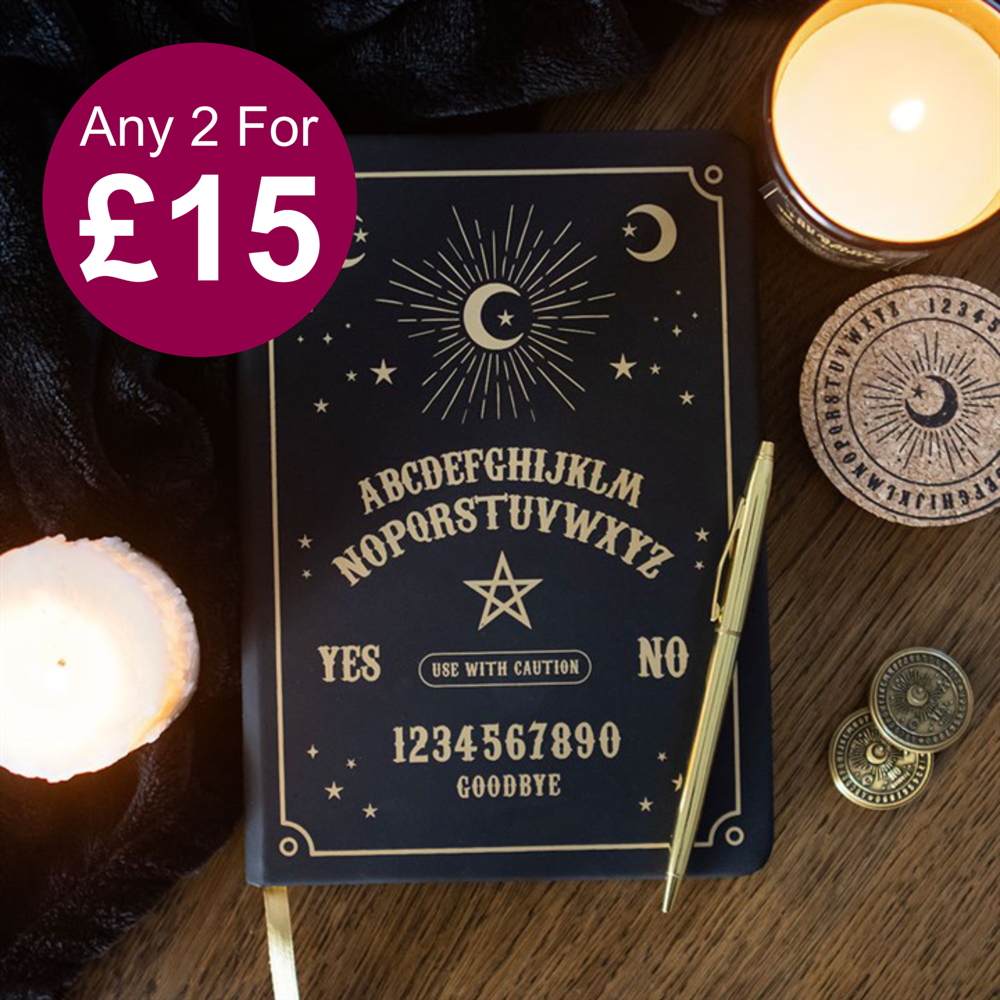 This elegant A5 notebook features a captivating talking board motif in a sophisticated black and gold palette, perfect for note-taking, list-making, or journaling. Enhanced with gold foil edges and a matching gold ribbon bookmark, it contains 100 sheets (200 lined pages) to bring a touch of refined charm to your workspace.