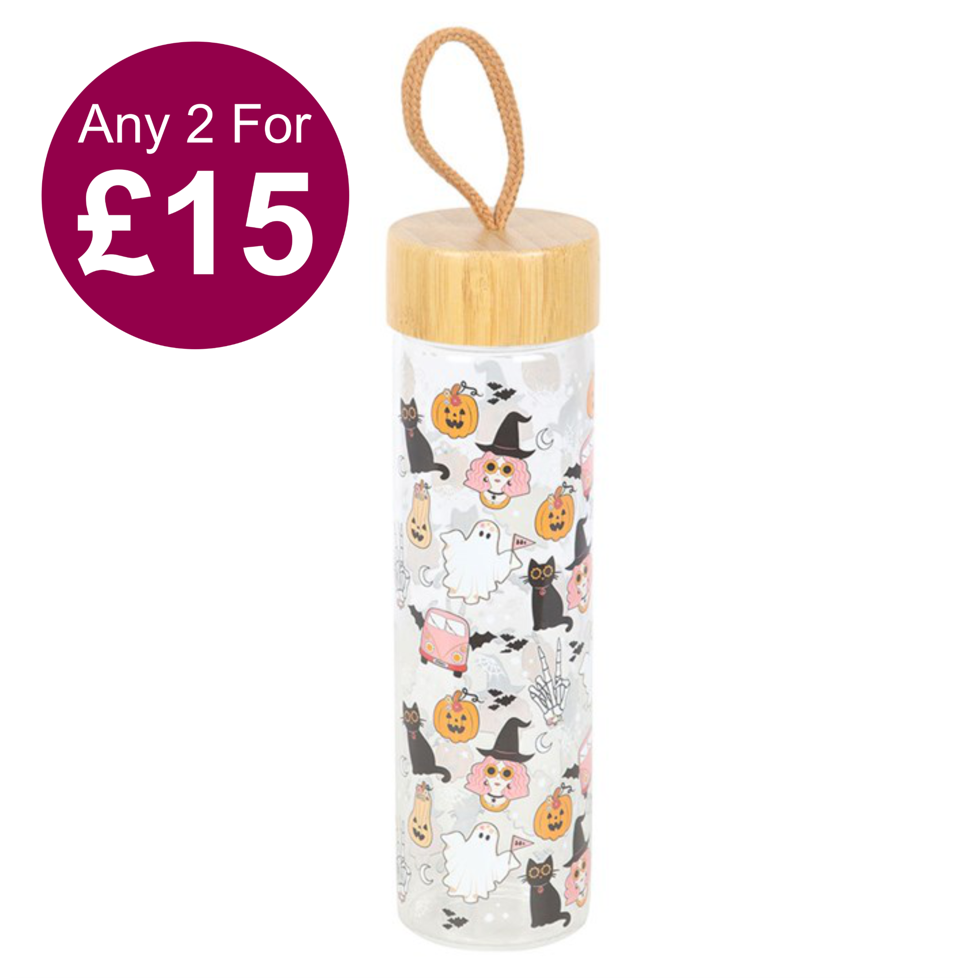 This glass water bottle combines functionality with a playful Halloween theme, showcasing a distinctive groovy ghost print. It features a stylish bamboo lid with a convenient loop for effortless transport. With a 600ml capacity, it’s ideal for staying refreshed throughout the day. Please note, it is not microwave-safe and should be handwashed to maintain its quality. An excellent choice for gifting or adding a unique flair to daily hydration.