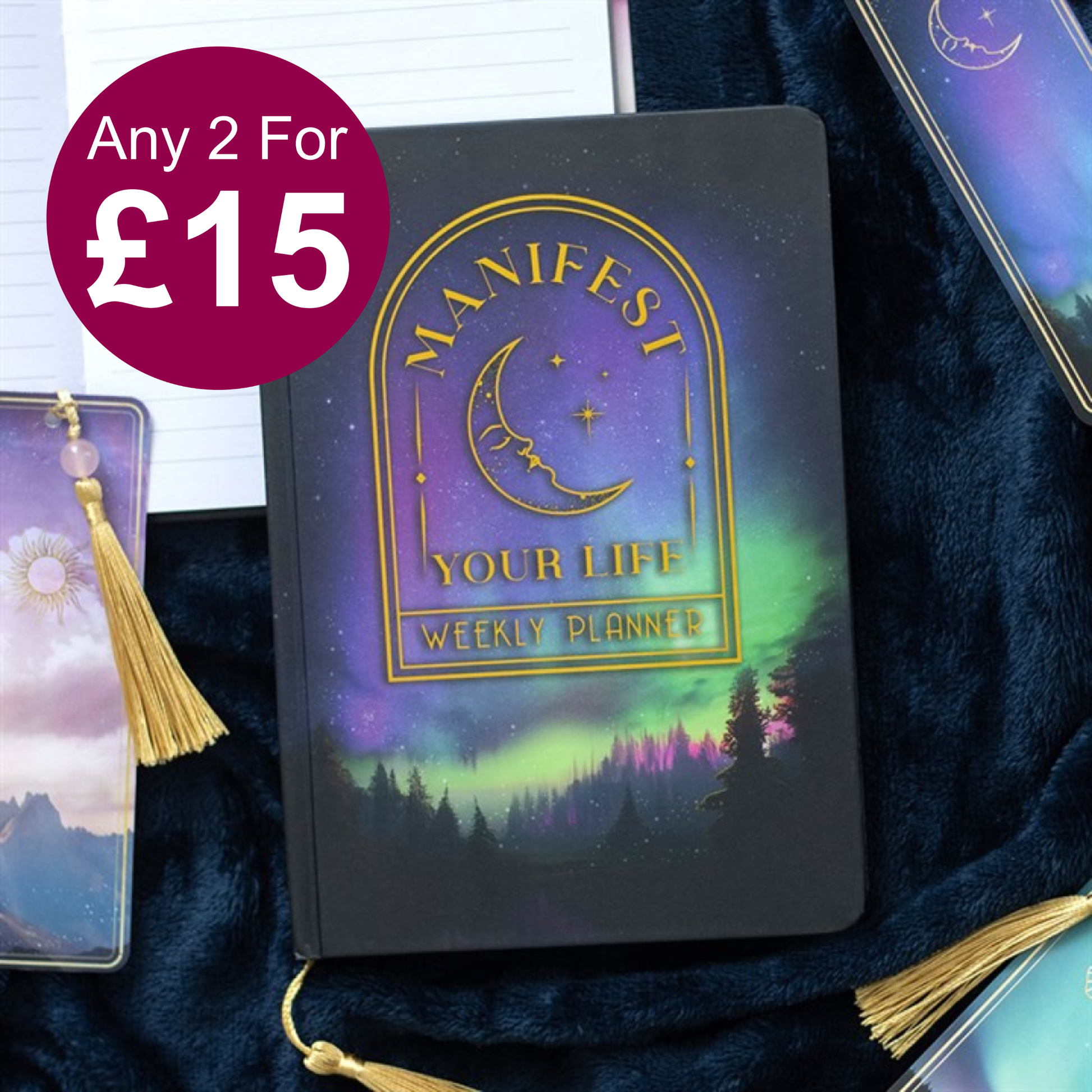 Maintain organisation and motivation with this enchanting A5 weekly planner notebook designed to elevate your mindset with each page. Its cover displays a striking forest illustration paired with the phrase 'Manifest your life' and a subtle gold foil moon. Holographic trim adds a touch of elegance, while a gold tassel bookmark allows quick access to your current page. Perfect for setting goals and planning your week, this planner merges style with functionality, making it an excellent tool for anyone committed to realizing their aspirations. Includes 100 sheets with 200 lined pages.