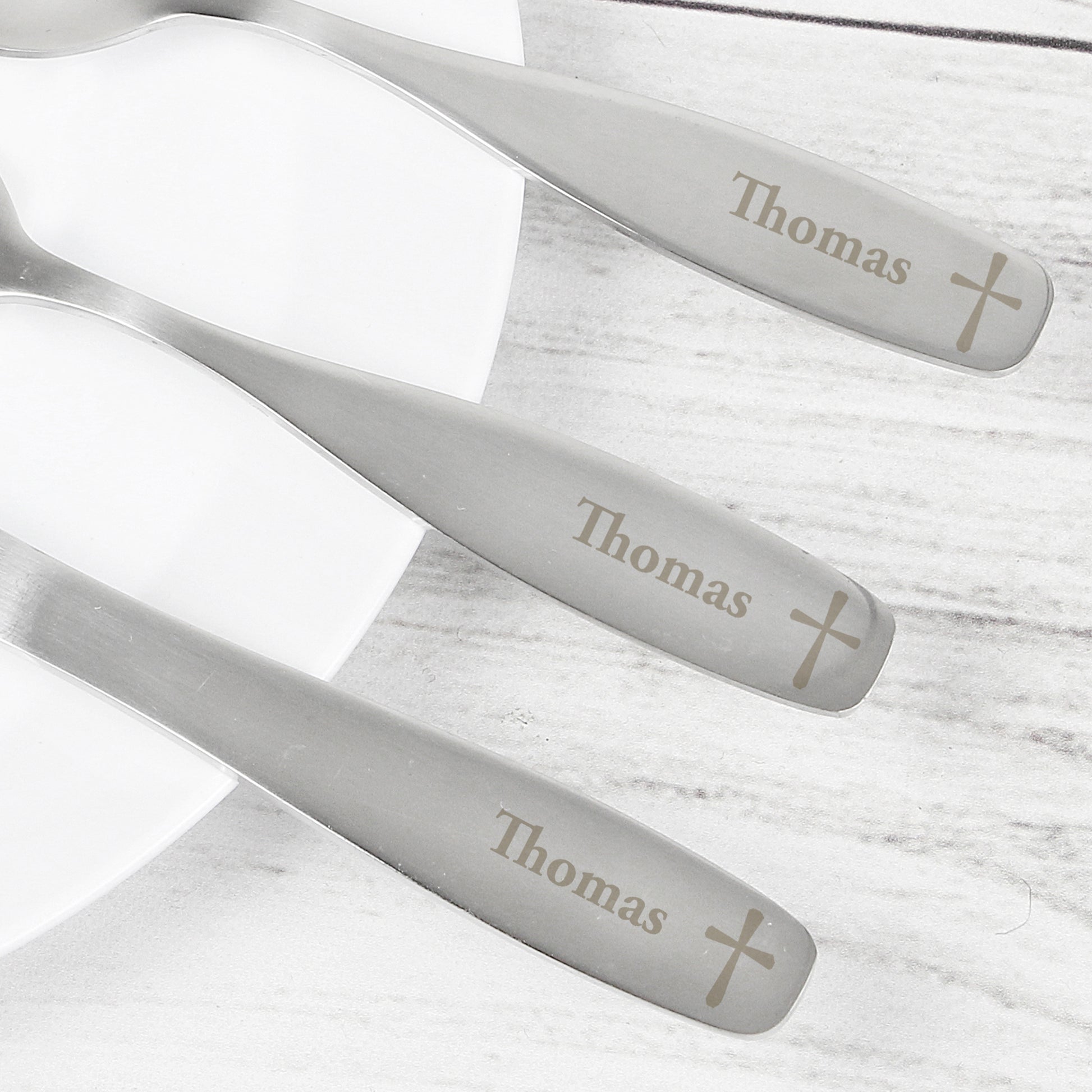 This 3 Piece Cross Cutlery Set makes an elegant christening gift. Crafted from stainless steel, it can be personalised with any name up to 15 characters, displayed exactly as provided. Please note, it is not suitable for children under 36 months. Dimensions: Fork 14.2cm, Knife 16.8cm, Spoon 13.7cm.