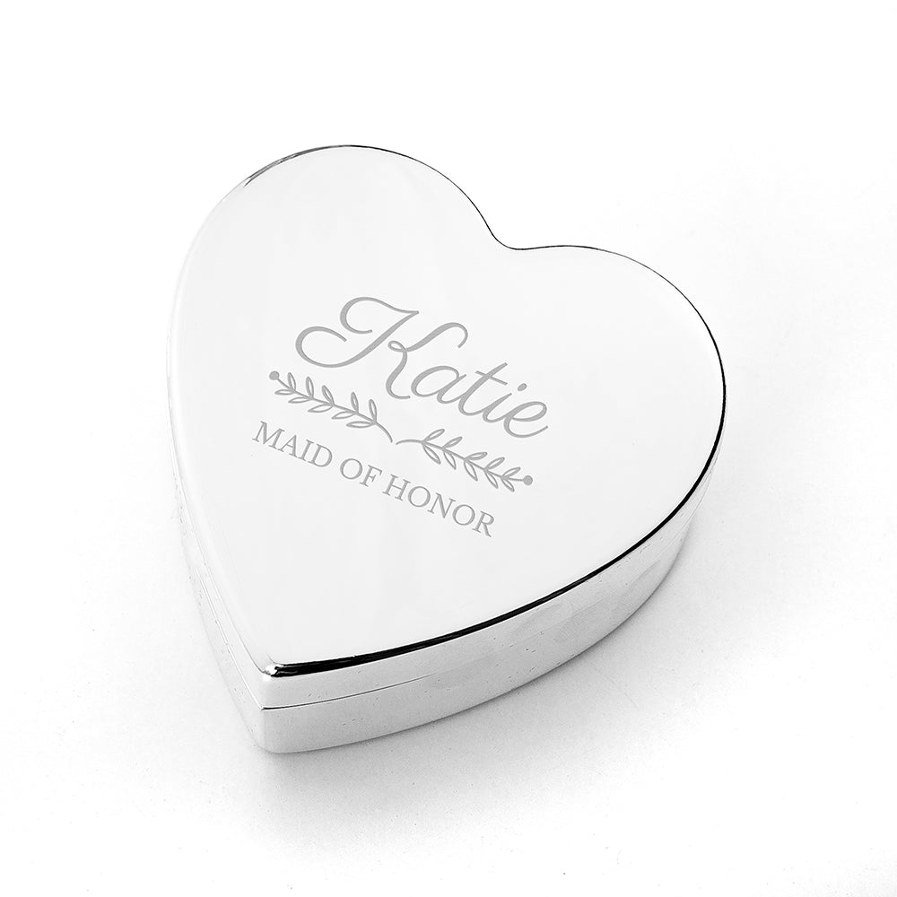 This refined heart-shaped jewellery box provides an ideal storage solution for cherished jewellery. Featuring a black felt lining, it protects rings, earrings, and necklaces from damage and tarnishing. Personalise it with a name and wedding role to create a meaningful memento honouring their part in your special day.
