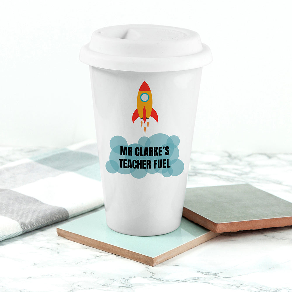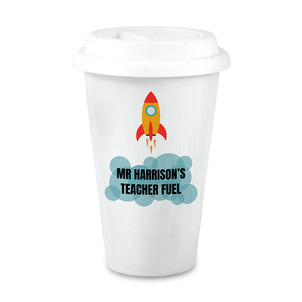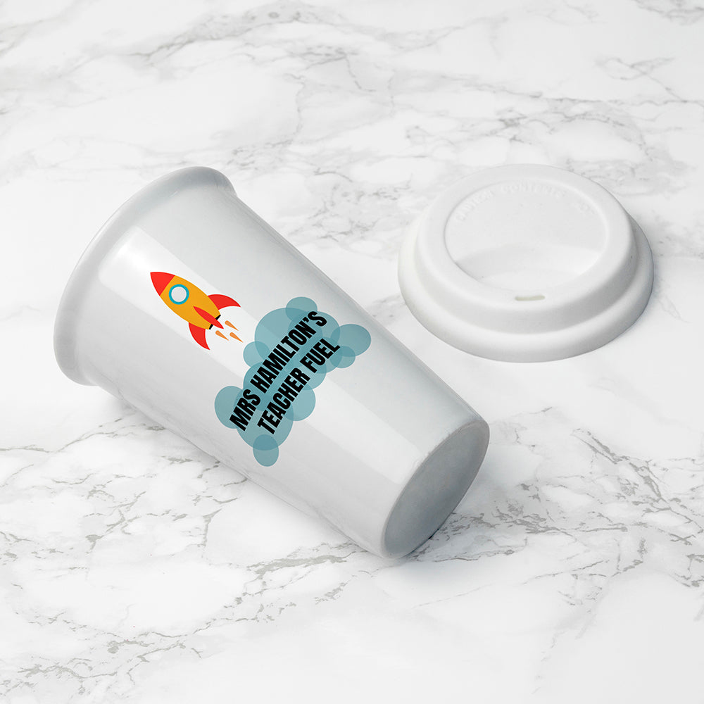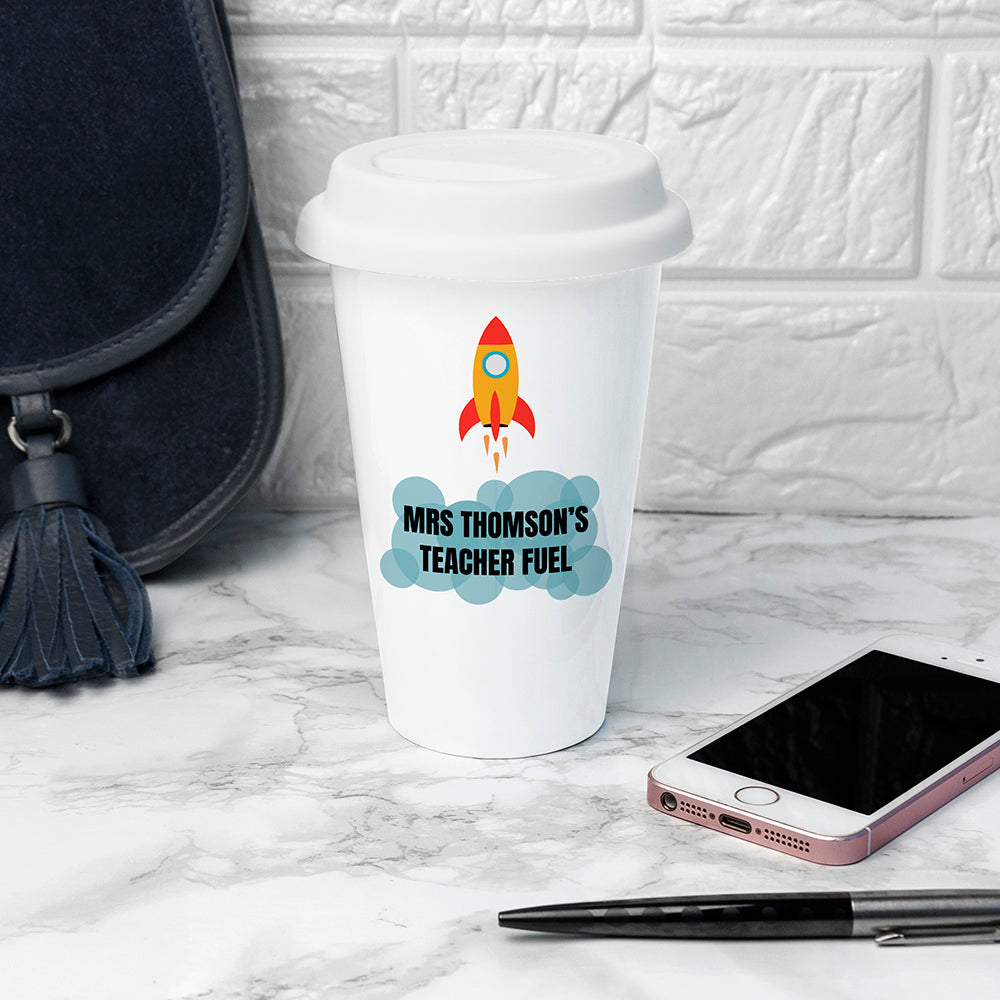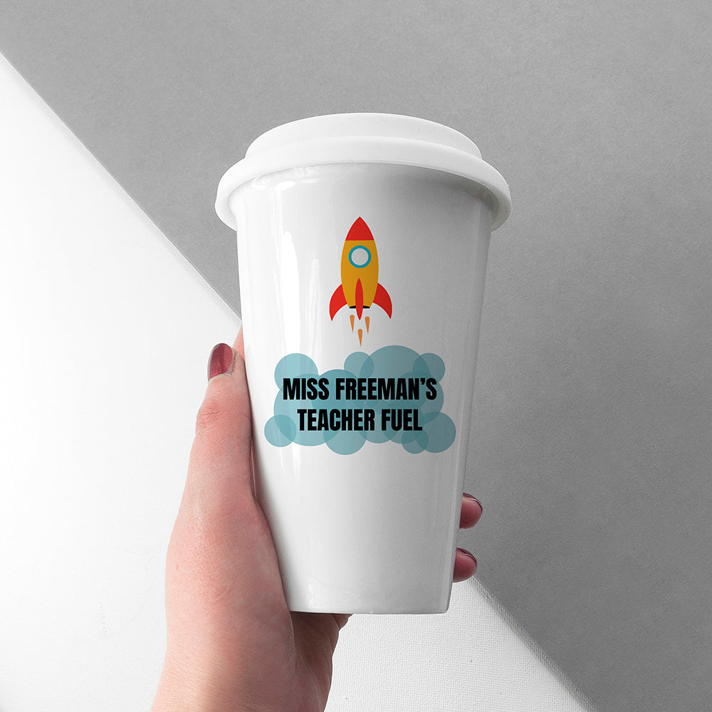 Celebrate the world’s greatest teacher with this double-insulated ceramic travel mug, ideal for on-the-go use. Customize the durable mug by adding a name, while the phrase 'teacher fuel' is included by default. Designed for convenience, this travel mug is safe for both dishwasher and microwave use.