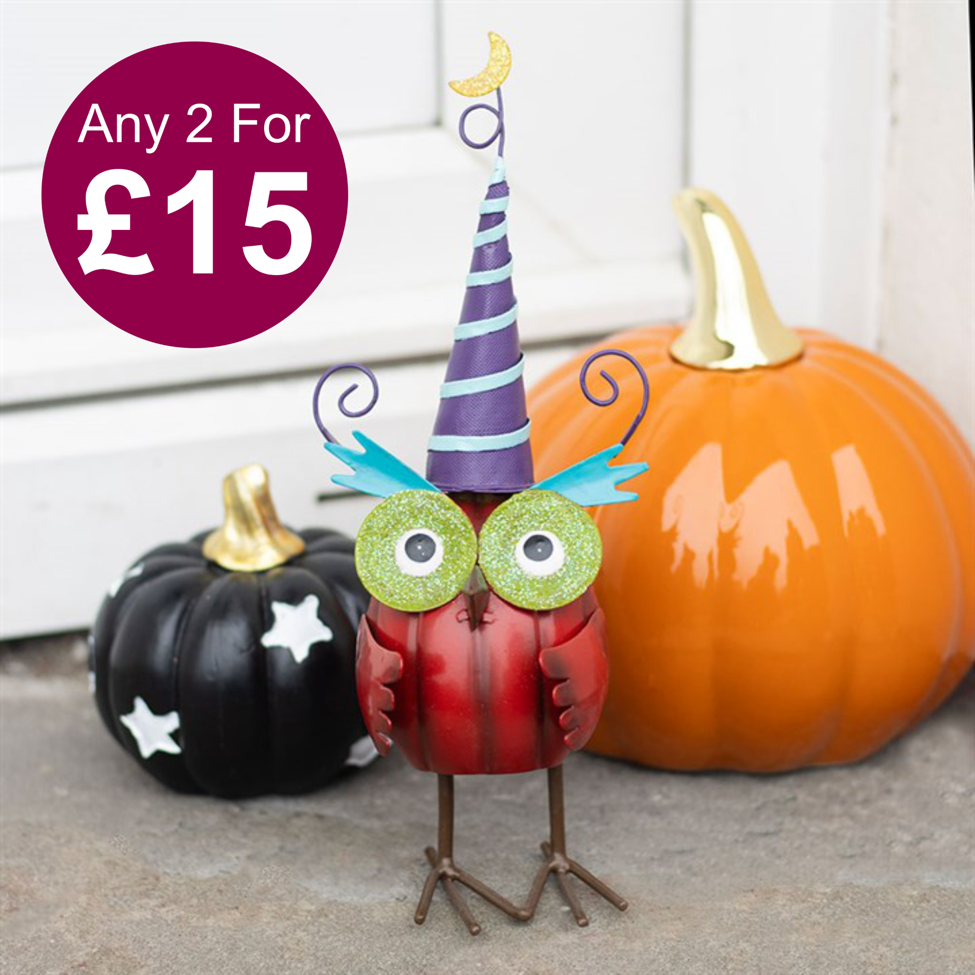 This charming red owl features a playful witch's hat and intricate curly wire accents, perfectly capturing the spirit of the spooky season. Its bright hues and delightful design make it an excellent choice for Halloween decorations, mantel displays, or autumn-inspired settings. Designed for outdoor use, it is best kept sheltered from severe weather conditions to maintain its appeal.