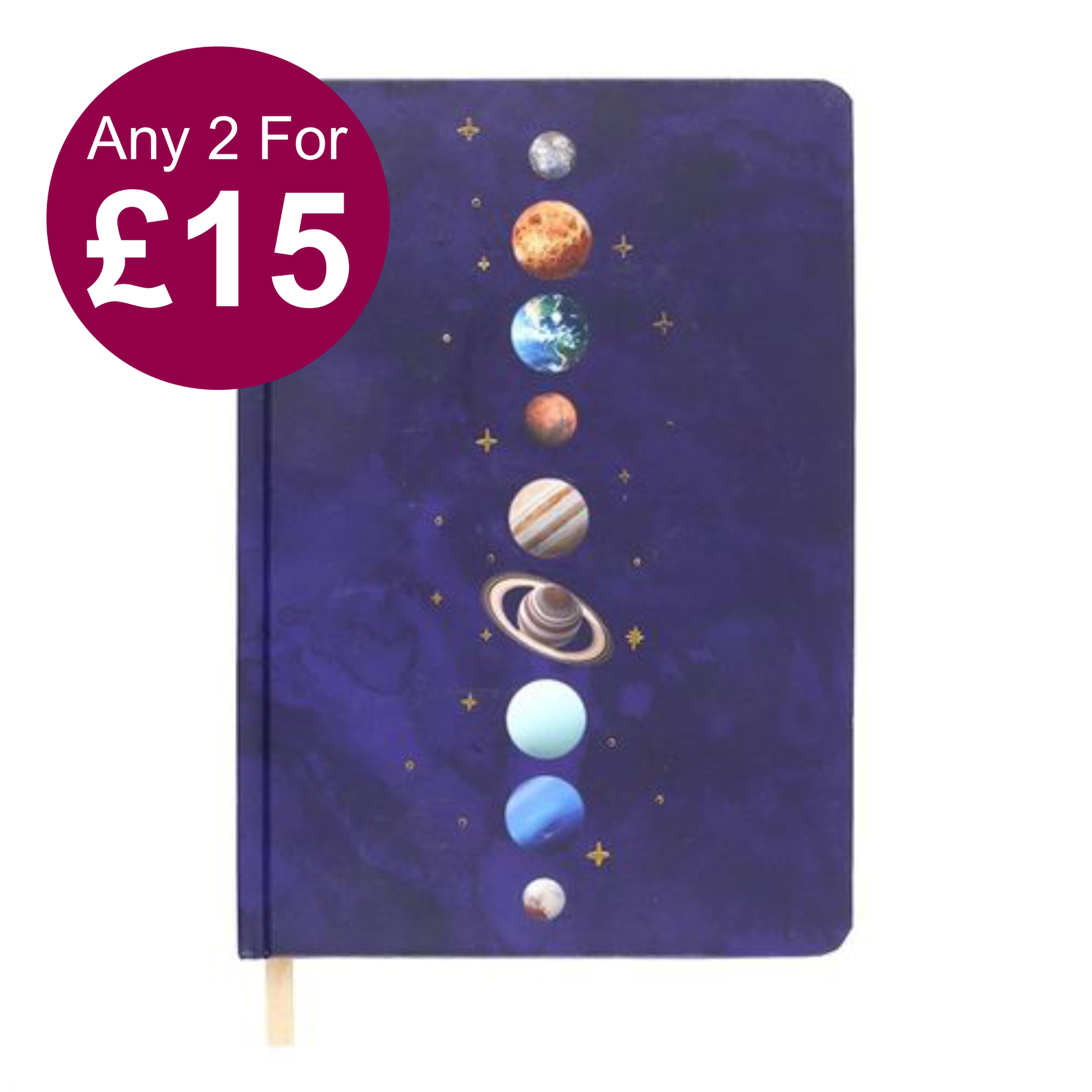 This exceptional A5 notebook is perfect for note-taking, list-making, or journaling, featuring an intricate solar system theme that brings a celestial touch to your workspace. It showcases nine planets and shimmering gold stars on a rich blue backdrop, complemented by gold foil-edged pages and a gold ribbon marker. With 100 sheets (200 lined pages), it combines aesthetic appeal with practical functionality.